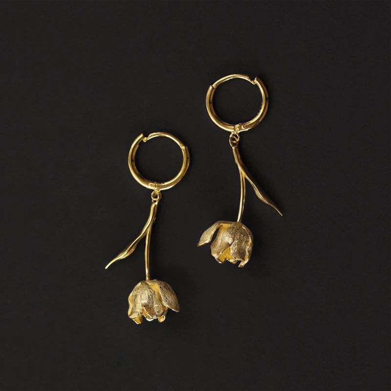Eleganti orecchini a cerchio con pendente a forma di tulipano, simbolo di eleganza e delicatezza.