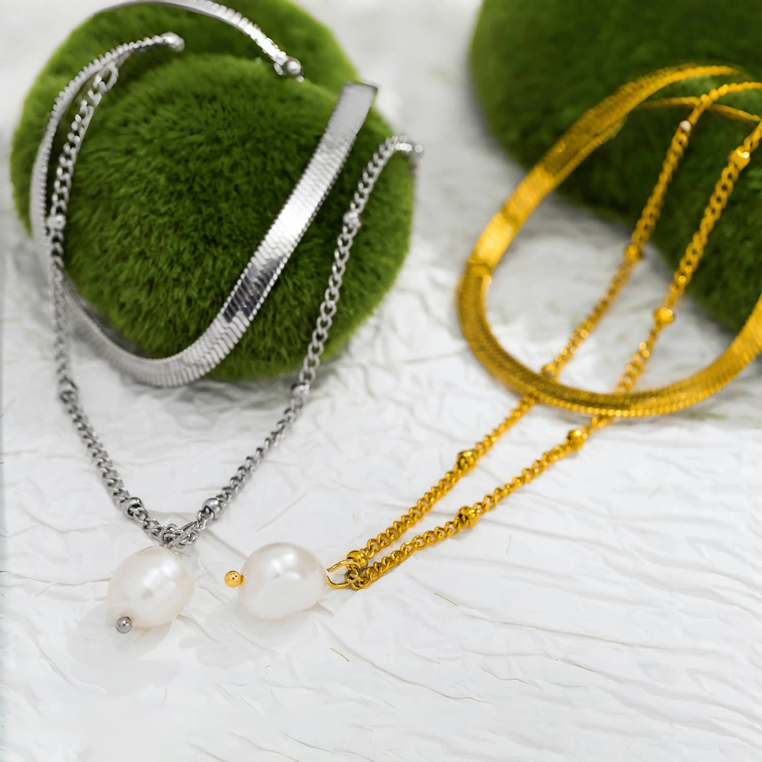 Un raffinato doppio strato che unisce la delicatezza della perla pendente alla luminosità della catena a serpente piatta.