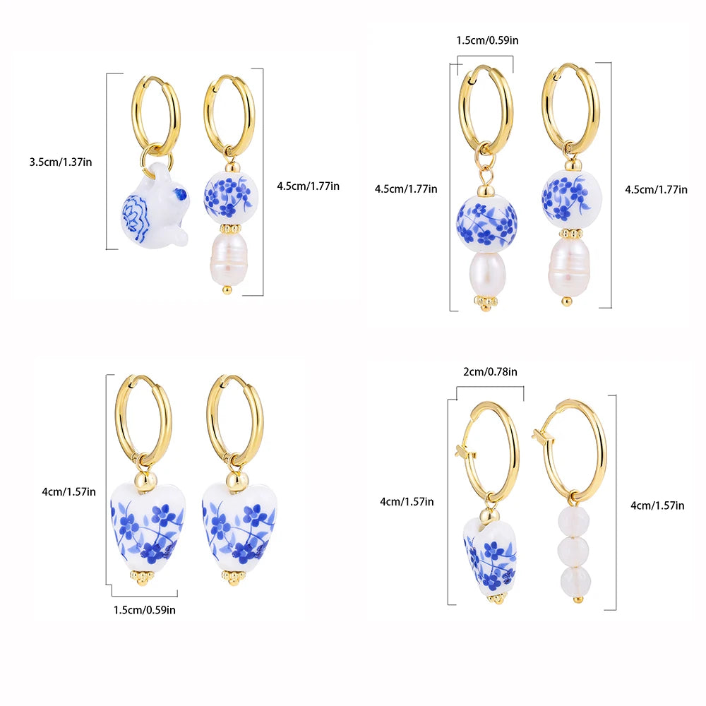 Orecchini pendenti dal fascino unico, che giocano con forme asimmetriche e dettagli delicati. Fiori bianchi e blu, cuori, perle e perline in ceramica si fondono in un design romantico e originale, impreziosito dalla struttura in acciaio inossidabile. Un accessorio elegante e creativo, perfetto per illuminare ogni look.