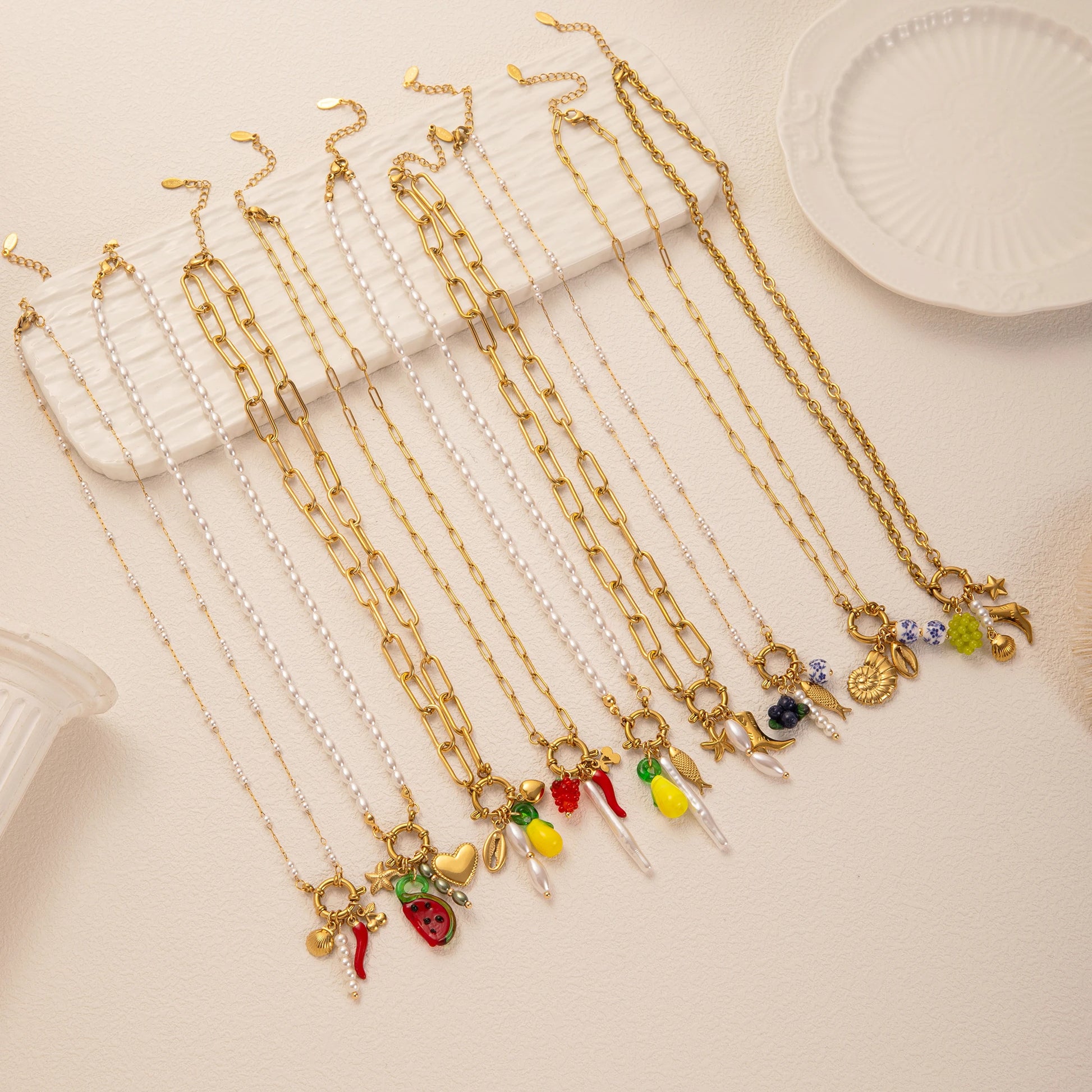 Realizzate in acciaio inossidabile placcato oro con dettagli in vetro colorato e perle, queste collane sono resistenti, eleganti e ipoallergeniche, perfette sia per l’uso quotidiano che per le occasioni speciali.