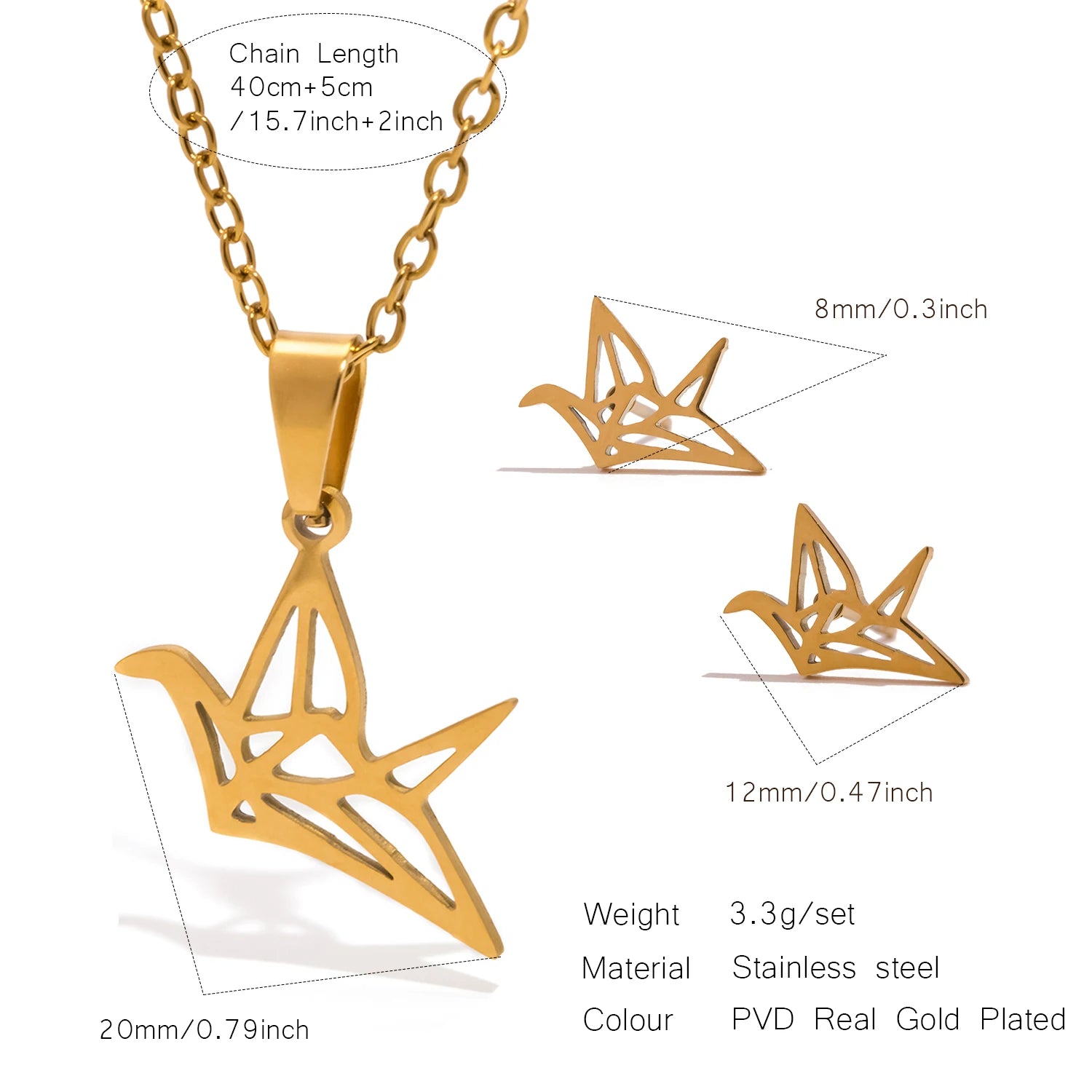 Composto da collana e orecchini coordinati con ciondolo a forma di origami di carta, è disponibile in due varianti: oro o argento.