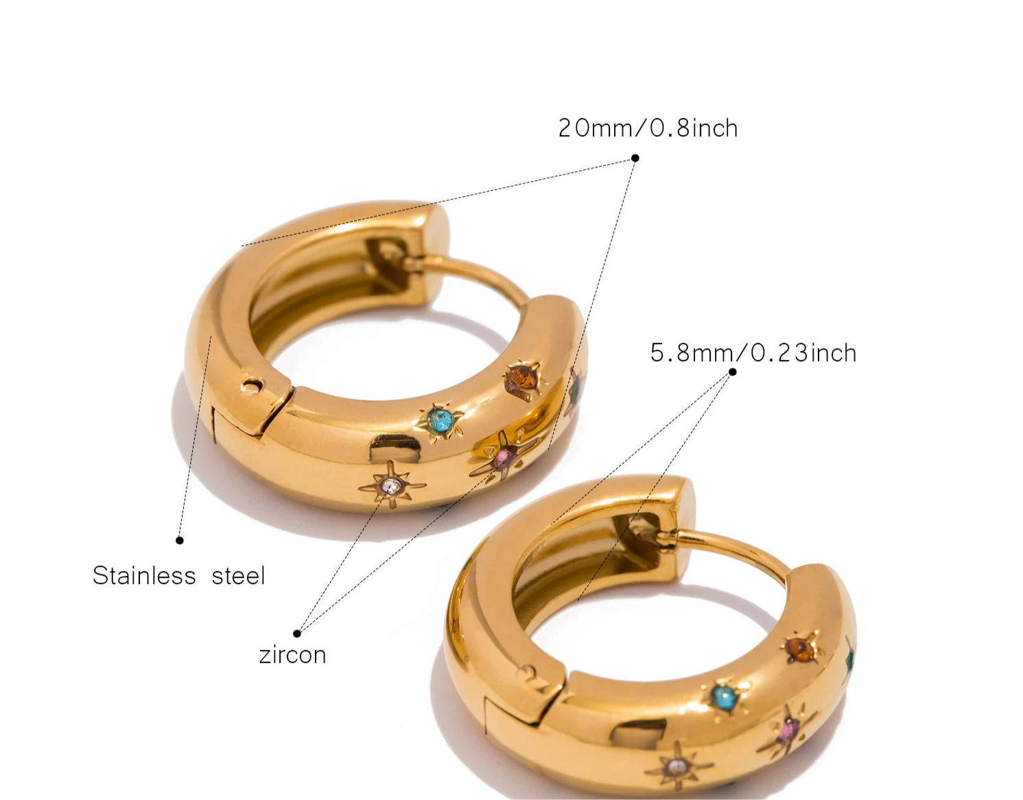 Questi orecchini a cerchio sono realizzati in acciaio inossidabile di alta qualità e rifiniti con una placcatura PVD che garantisce una brillantezza duratura. Le piccole stelle intarsiate con zirconi colorati donano movimento e luminosità, rendendoli perfetti per chi cerca un gioiello elegante ma anche originale.