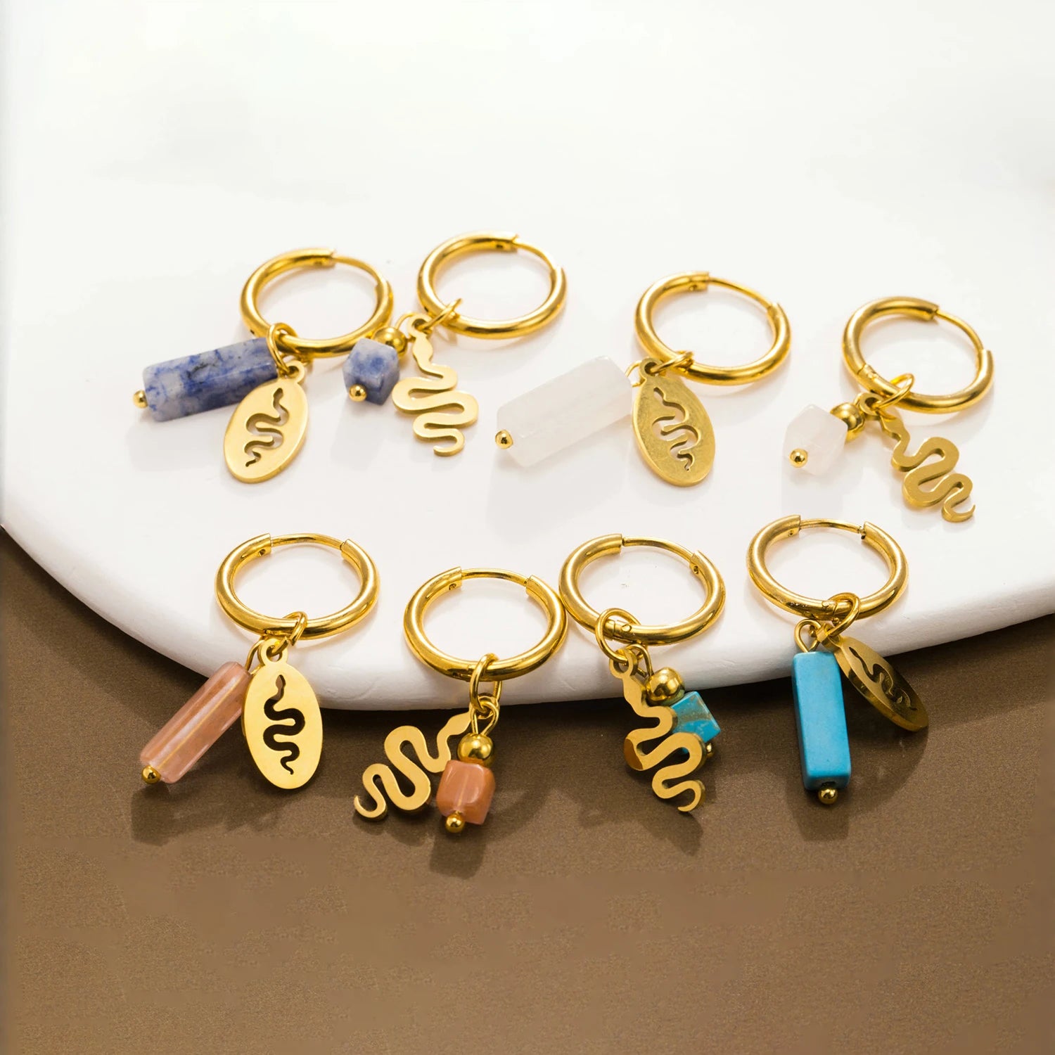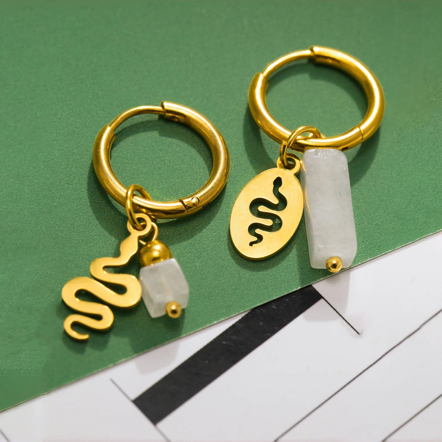 Orecchini pendenti raffinati con motivo serpente e ciondoli di pietre naturali disponibili in quattro varianti: