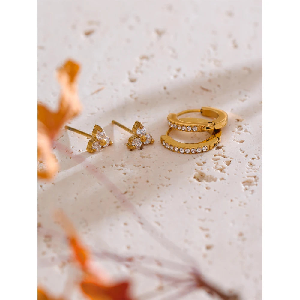 Composto da due paia di orecchini in acciaio inossidabile placcato oro e platino, racchiude forme e dettagli diversi: mini cerchi tempestati di zirconi, punti luce luminosi e piccoli orecchini geometrici.