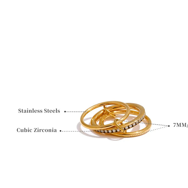Questo raffinato set di tre anelli uniti in acciaio inossidabile dorato incarna la perfetta armonia tra minimalismo e brillantezza.
