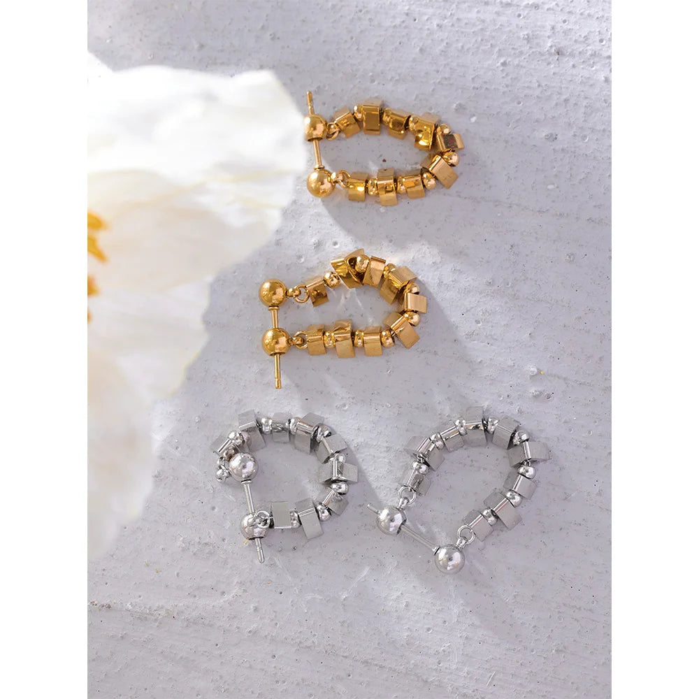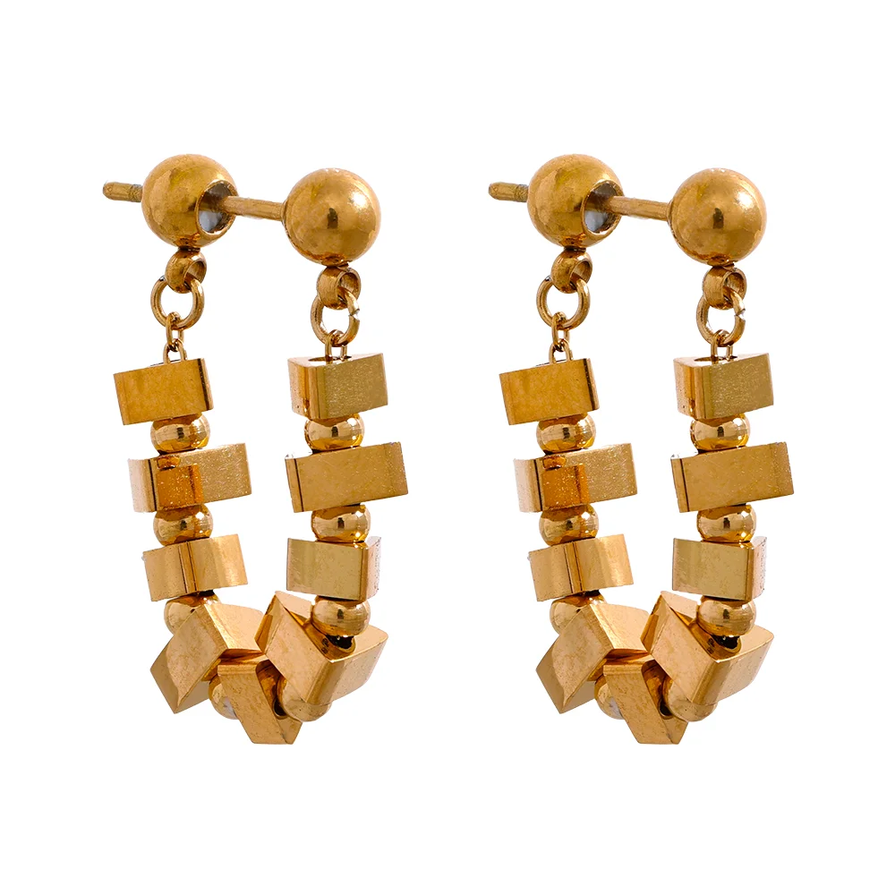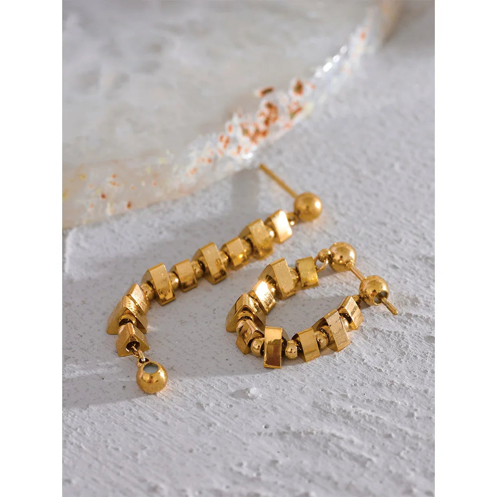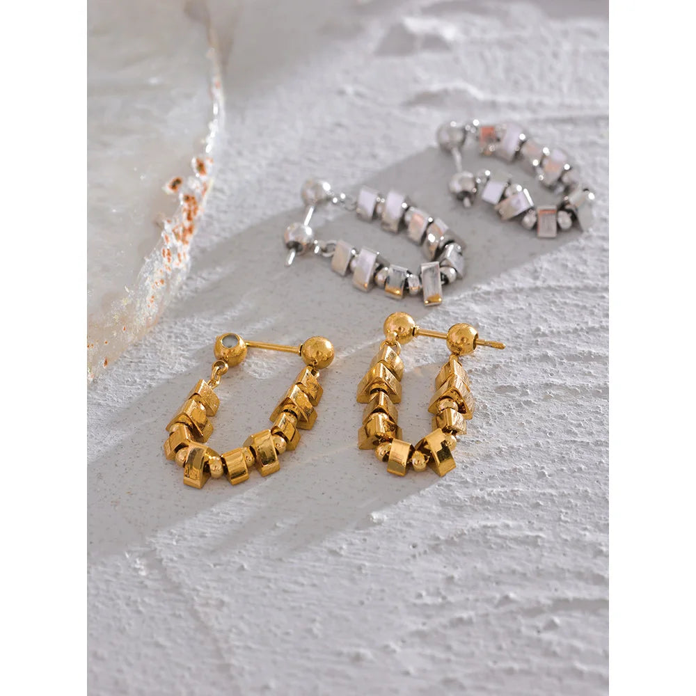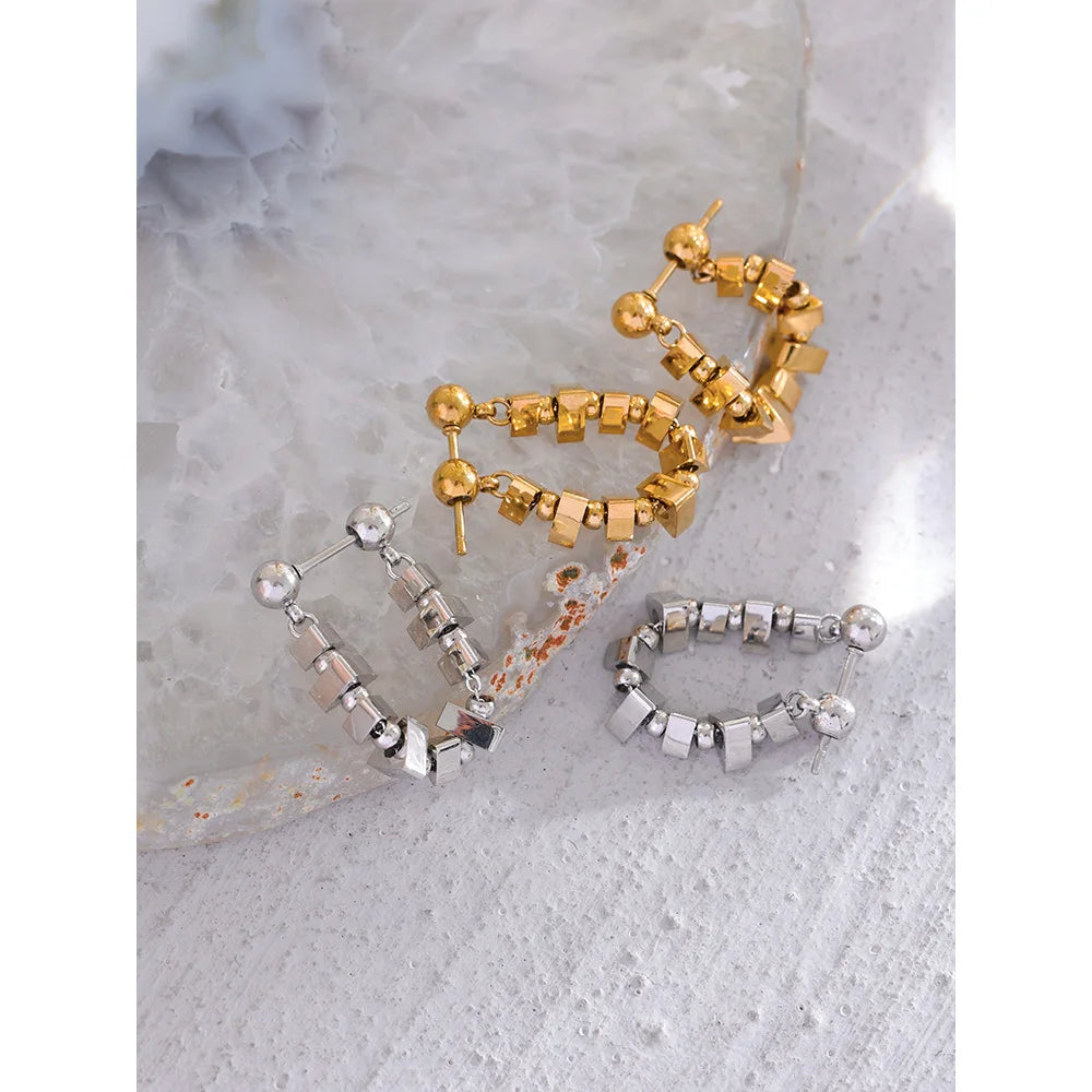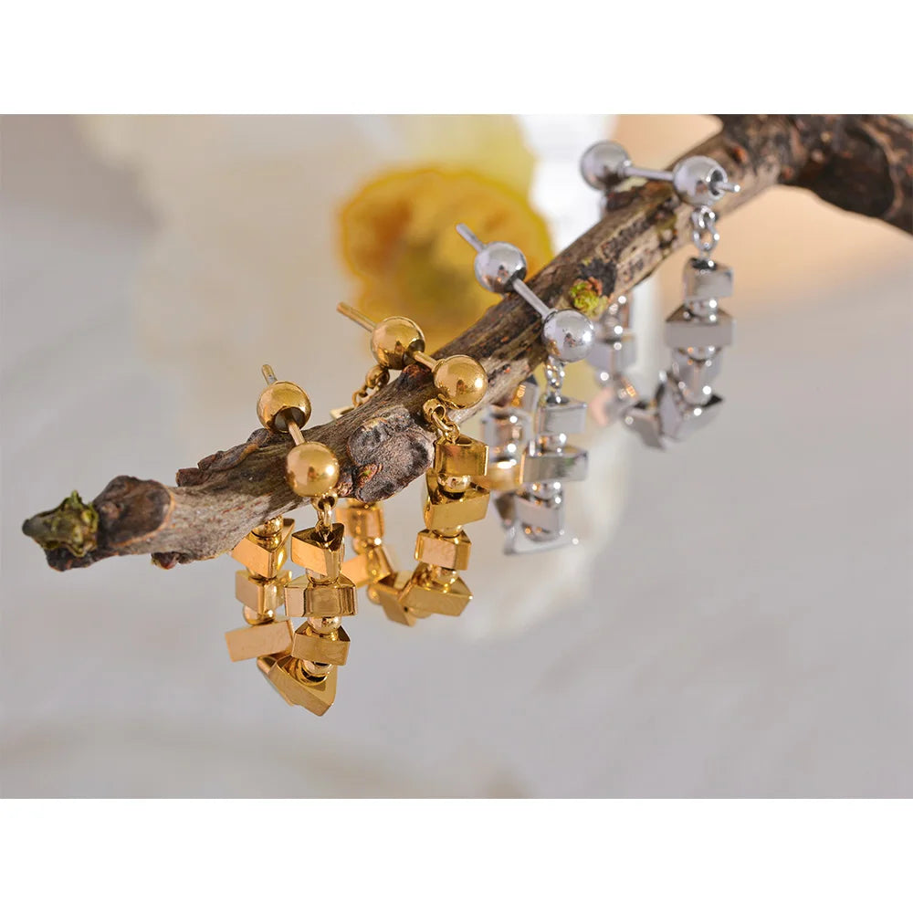 Realizzati in acciaio inossidabile 316L e placcati in oro o argento PVD 18K, presentano una catena di piccoli elementi quadrati lucidi che riflettono la luce da ogni angolazione, creando un effetto scintillante ma sofisticato.