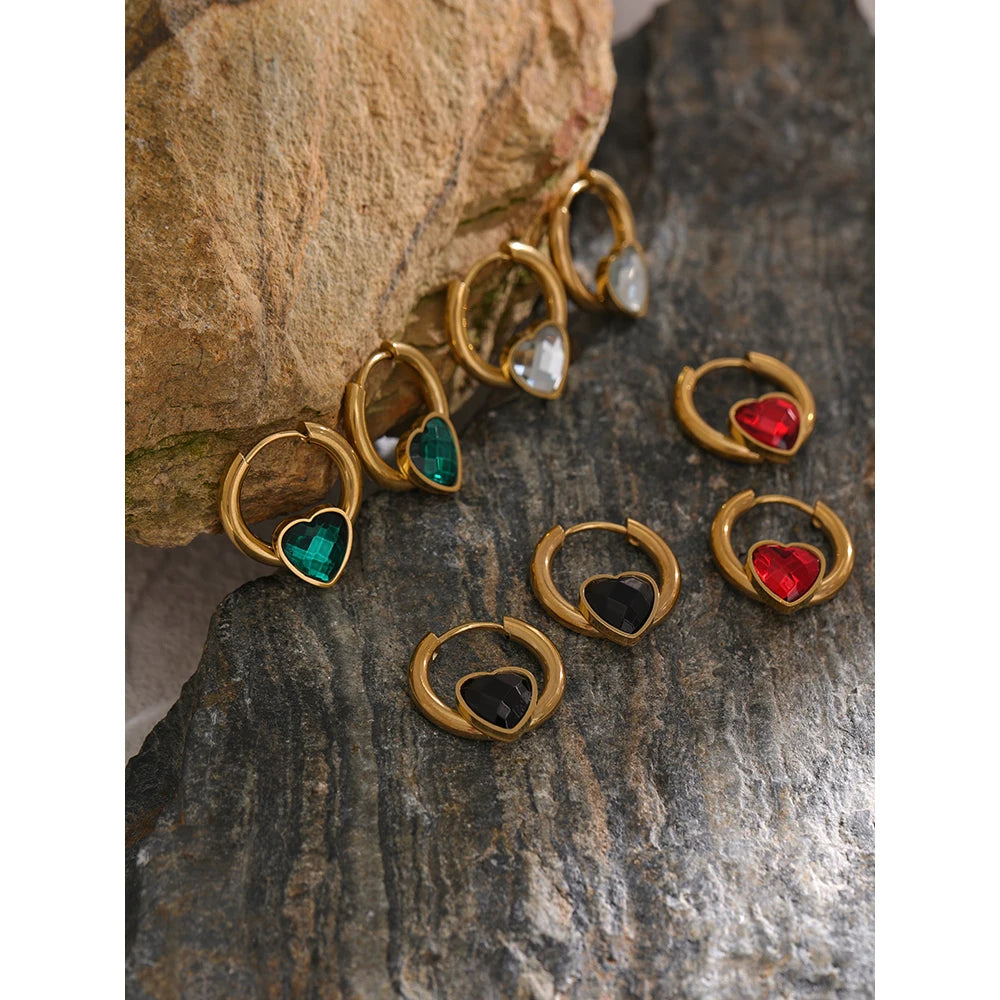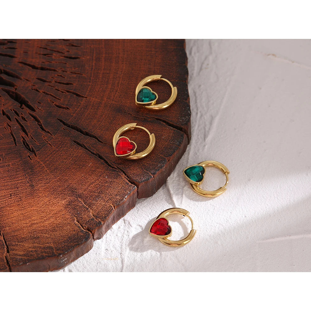 Romantici e luminosi, questi orecchini a cerchio in acciaio inossidabile placcato oro sono impreziositi da un cuore di zirconia cubica sfaccettata che cattura la luce da ogni angolazione. Disponibili in 5 varianti di colore (nero, rosso, bianco, verde, rosa), rappresentano il perfetto equilibrio tra eleganza e dolcezza.