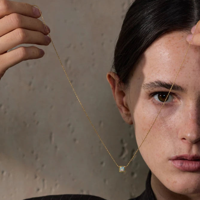 Questa collana presenta una catena elegante in acciaio inossidabile placcato oro e un raffinato pendente quadrato con opale naturale, che riflette sfumature uniche e iridescenti. Un design delicato e contemporaneo, perfetto per ogni occasione.