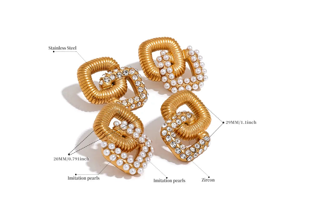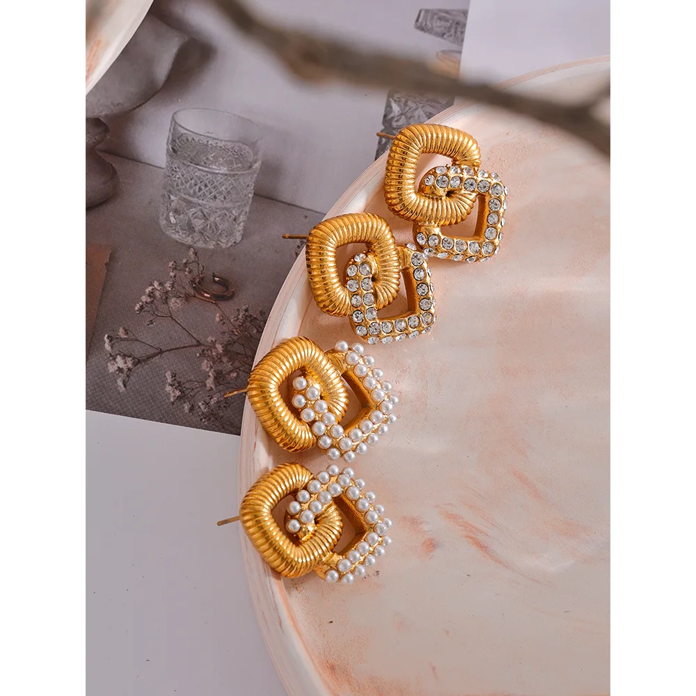 Orecchini Geometrici Vintage Quadrati β Zirconi o Perle, Acciaio Inossidabile Dorato