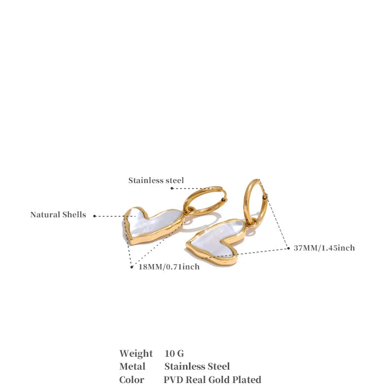 Orecchini eleganti e romantici con ciondolo a cuore realizzato in conchiglia naturale. La montatura in acciaio inossidabile placcato oro 18K con finitura PVD garantisce resistenza, brillantezza e lunga durata.