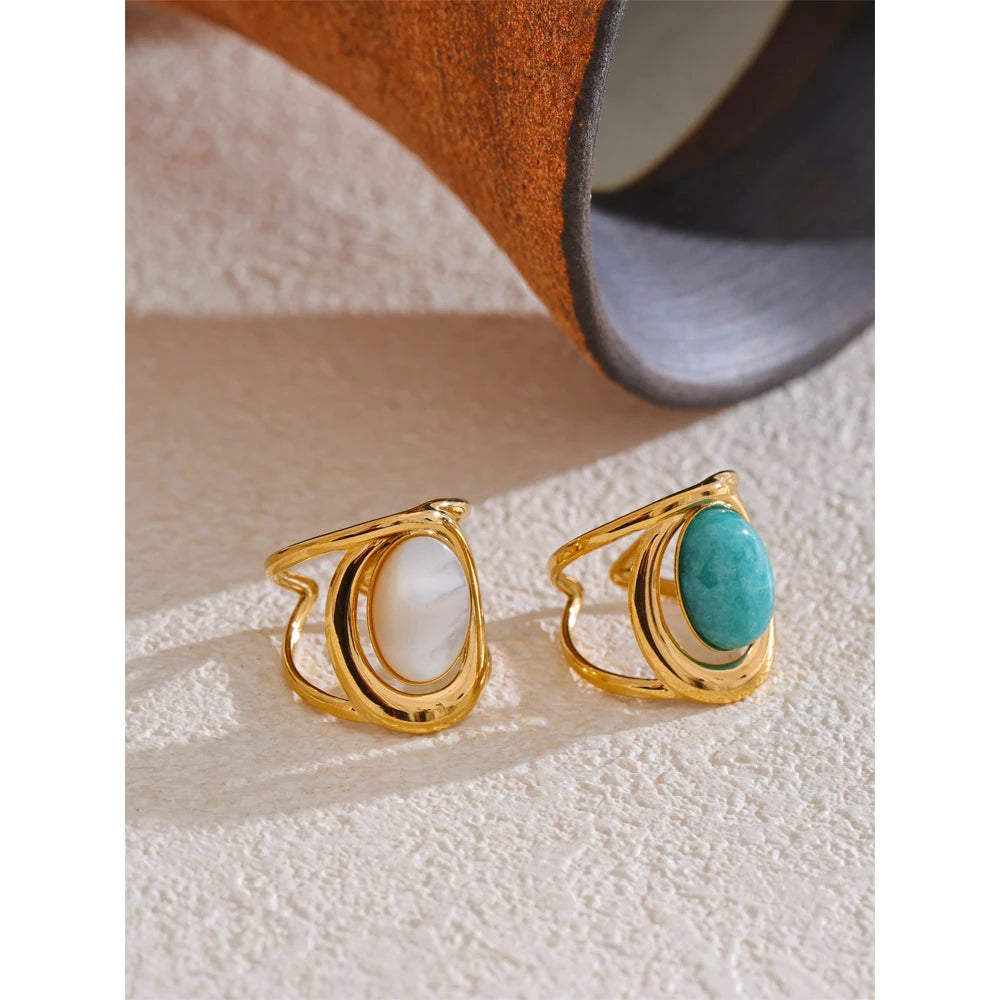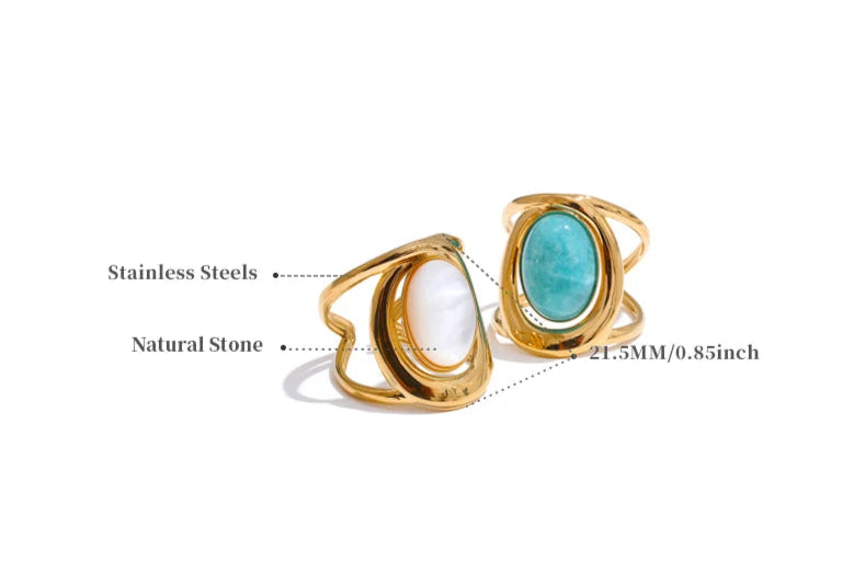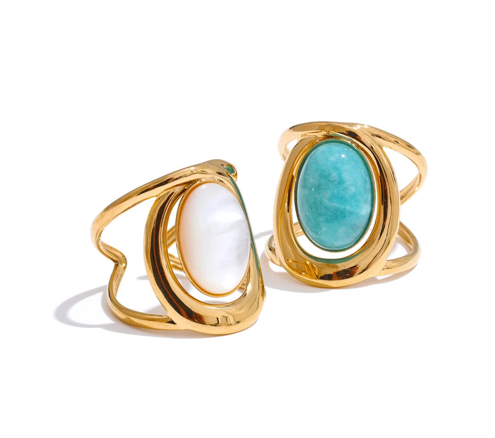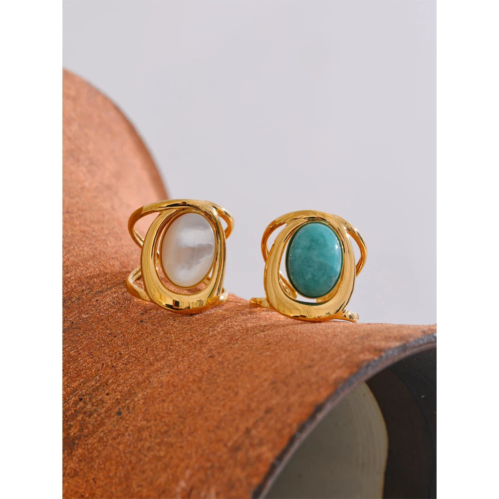 Realizzato in acciaio inossidabile placcato oro PVD, brilla con riflessi caldi e luminosi che incorniciano una pietra naturale ovale – disponibile in verde acqua o madreperla – simbolo di equilibrio e purezza.