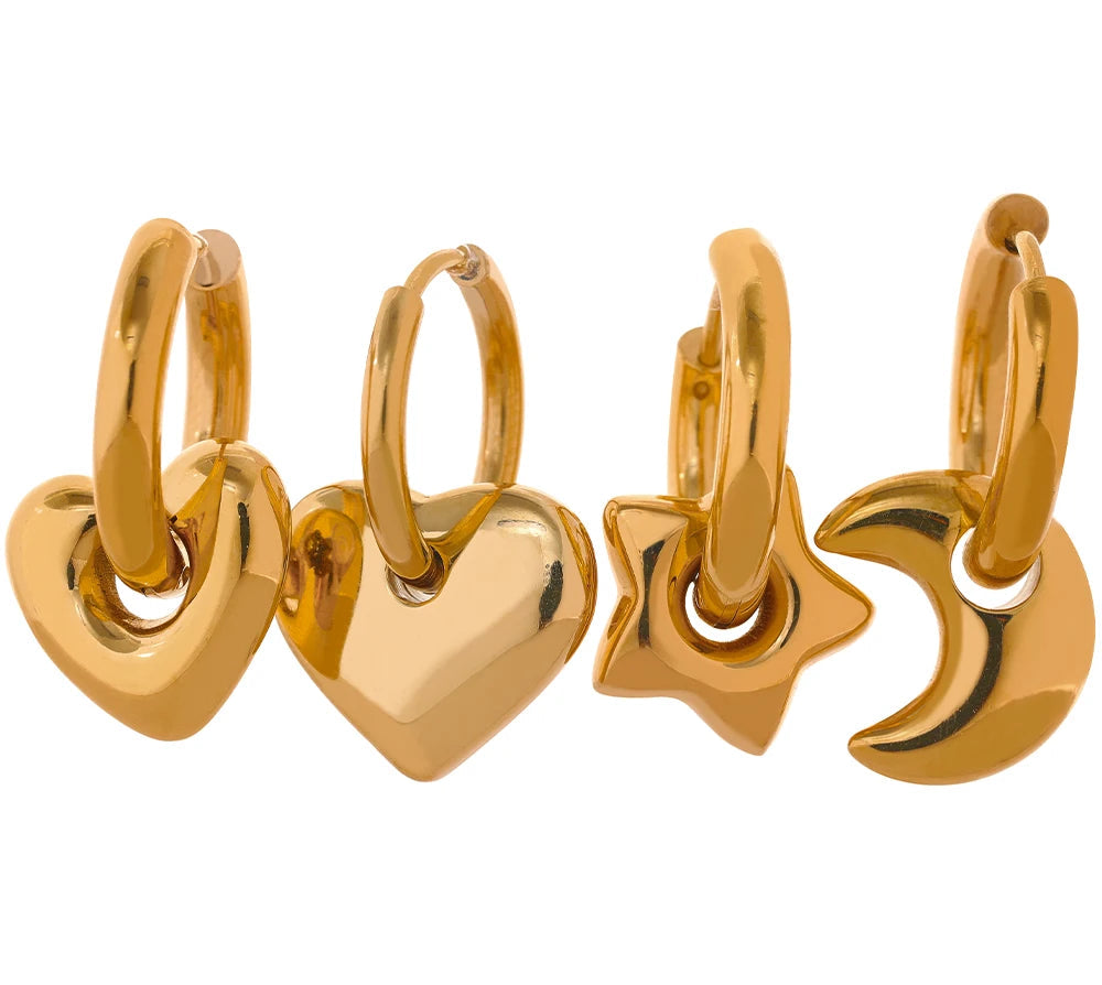 Realizzati in acciaio inossidabile 316L e placcati in oro o argento PVD 18K, presentano piccoli charm dalle forme simboliche — stella, luna o cuore — perfettamente bilanciati su cerchi sottili e luminosi.